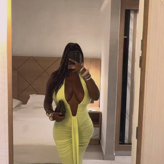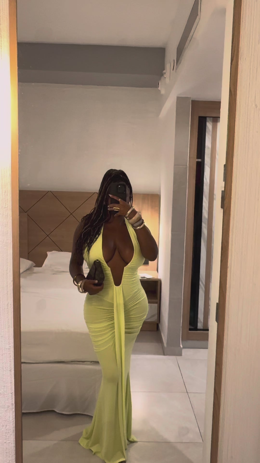 She is lime green, An elegant and sexy dress. The perfect fit for all your curves. A custom fit made just for you. Please advise this dress takes up to 10 days to receive, she is made by order. True to size because of stretch material, however made for elegance elongated. so please wear a heel to avoid damage to the bottom. Or order a size down if you prefer length shorter.
